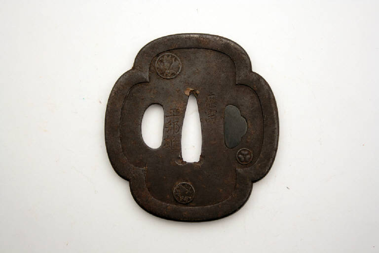 Elsa di spada giapponese di forma quadrilobata (mokko), con bordo ripiegato sulla superficie. Sono presenti i tre fori canonici, quello centrale (nakagoana) per il codolo, il foro di sinistra (kozuka hitsuana) per il coltellino, e quello di destra (kogai hitsuana) per lo spillone, riempito da una piastrina di shakudo. Sono rappresentati degli stemmi familiari (kamon) giapponesi, tra i quali si distingue quello del clan Taira, a farfalla (agehanocho).