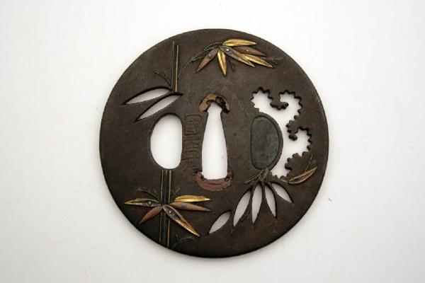 Elsa di spada giapponese di forma tonda. Sono presenti i tre fori canonici, quello centrale (nakagoana) per il codolo, il foro di sinistra (kozuka hitsuana) per il coltellino, e quello di destra (kogai hitsuana) per lo spillone, riempito da una piastrina di shakudo. La decorazione è realizzata in parte a traforo (sukashi) in negativo, in parte a rilievo con intarsi d'oro e rame e rappresenta steli di bambù fogliati, con gocce di rugiada, in argento.