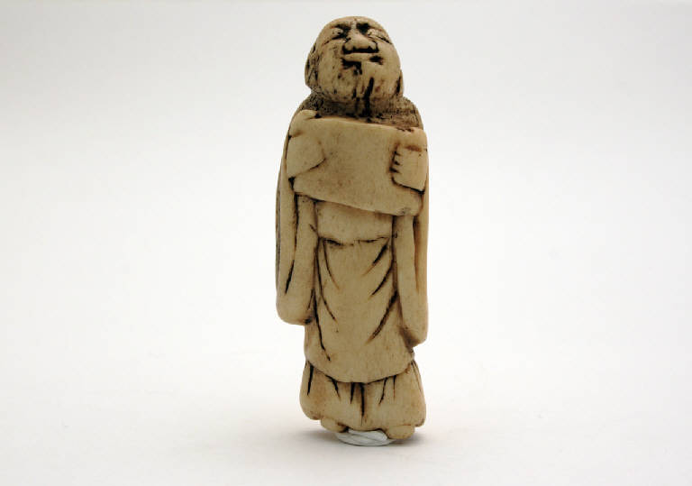 Netsuke, fermaglio per cintura, in osso scolpito a tuttotondo e patinato raffigurante un monaco stante, con lunga veste, con un rotolo aperto fra le mani. Sul dorso di trovano i due fori obliqui (himotoshi) da cui si faceva passare il cordoncino in seta.