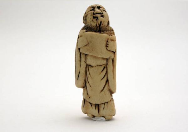 - NOTIZIE STORICO CRITICHE Il netsuke è un accessorio dell'abito tradizionale giapponese che permetteva di sospendere alla cintura una serie di oggetti quali l'astuccio per sigillo o per medicinali (inro), la borsa da tabacco e la pipa, il completo da scrittura (yatate), oppure il borsello o la bottiglietta per il profumo. Questi oggetti erano detti "koshisage" o "sagemono", cose sospese - ai fianchi. Essi erano legati a un cordoncino che passava per una piccola perla, lo "ojime", e infine al netsuke che fungeva da contrappeso e andava a fermarsi alla cintura. Il netsuke nasce infatti per permettere di sfilare gli oggetti dalla cintura senza doverli slegare e legare continuamente.\n\nPotrebbe trattarsi di un rakan (arhat), uno dei discepoli del Buddha.