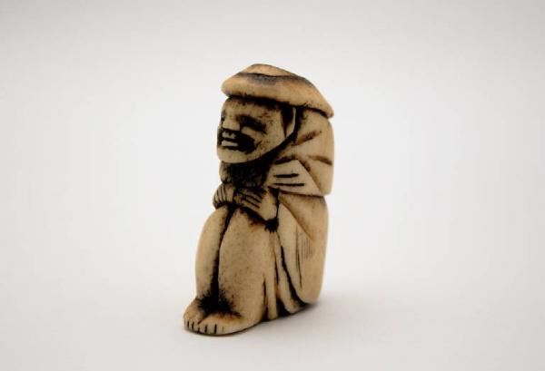 Netsuke, fermaglio per cintura, in osso scolpito a tuttotondo e patinato, raffigurante un personaggio accovacciato a terra avvolto da una lunga veste e da un grosso cappello che gli copre parte della schiena. Le gambe che spuntano dalla veste hanno l'aspetto di zampe.\nL'osso presenta macchie giallastre in alcuni punti. Su un lato sono presenti i due fori obliqui (himotoshi) da cui si faceva passare un cordoncino in seta.