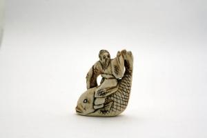 - NOTIZIE STORICO CRITICHE La leggenda di Kinko sennin si fa risalire alla Cina del XII secolo, e narra del maestro cinese Qin Gao, che fu invitato dal Re delle acque a visitare il suo mondo. Quando tornò a cavallo di una carpa, istruì i suoi discepoli a non mangiare più pesce.\n\nIl netsuke è un accessorio dell'abito tradizionale giapponese che permetteva di sospendere alla cintura una serie di oggetti quali l'astuccio per sigillo o per medicinali (inro), la borsa da tabacco e la pipa, il completo da scrittura (yatate), oppure il borsello o la bottiglietta per il profumo. Questi oggetti erano detti "koshisage" o "sagemono", cose sospese - ai fianchi. Essi erano legati a un cordoncino che passava per una piccola perla, lo "ojime", e infine al netsuke che fungeva da contrappeso e andava a fermarsi alla cintura. Il netsuke nasce infatti per permettere di sfilare gli oggetti dalla cintura senza doverli slegare e legare continuamente.