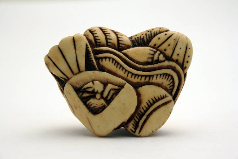 Netsuke, fermaglio per cintura, in osso scolpito a tuttotondo e patinato raffigurante un gruppo di conchiglie, da una delle quali esce un piccolo granchio. La struttura dell'oggetto segue la forma cava dell'osso. Al centro della base è stato praticato un foro passante per legare il cordoncino di seta.
