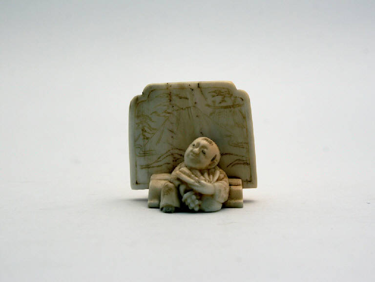 Statuetta, okimono, in avorio, raffigurante un bambino seduto di fronte a un paravento a pannello unico (tsuitate) con dipinto il monte Fuji, su un lato, e un paesaggio con due pini, sull'altro. Il bambino, riconoscibile p\ner il taglio dei capelli con il ciuffo sulla fronte, indossa un kimono decorato con fiori di crisantemo, tiene un ventaglio aperto decorato a motivi geometrici nella mano sinistra, mentre nella destra ha un sistro (shakujo), strumento per riti religiosi formato da un grappolo di campanelli.