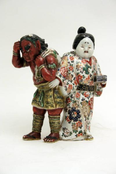 - NOTIZIE STORICO CRITICHE Fujin è il dio Shintoista del vento, che sorregge la sacca riempita con aria. La figura al suo fianco appartiene probabilmente a un racconto folcloristico, letterario o teatrale nel quale è presente Fujin. La tavolozza degli smalti è coerente con quella utilizzata per le produzioni di Imari (Arita), Kutani e molte altre fornaci private fiorite durante il periodo Meiji.