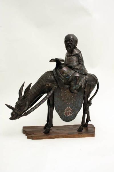 - NOTIZIE STORICO CRITICHE La figura di un uomo anziano con la barba, è l'emblema del "saggio" cinese, l'uomo letterato che ha raggiunto l'illuminazione e la pace interiore. L'immagine del saggio che viaggia a dorso di un animale (asino, mulo o cavallo) assorto nella lettura di un libro, e dunque ignorando il cammino, allude all'abbandono dei timori e degli interessi terreni. La statuetta evoca anche i detti "zouzhe qiao" (cammina e vedi).\nQuesto animale ha una valenza positiva in quanto porta i pesi dei libri del letterato e lavora contro le avversità.\n\nStatuine in bronzo con la medesima figura erano prodotte in discreta quantità nel Giappone Meiji, forse più per soddisfare il gusto degli stranieri che quello dei giapponesi stessi.\n\nGli smalti cloisonné sono stati importati in Giappone dalla Cina, che per prima ha sviluppato e migliorato una tecnica di origine occidentale. Adoperati soprattutto per i fornimenti di spada, gli smalti giapponesi non erano però utilizzati su grandi superfici. Solo attorno alla seconda metà del XIX secolo, in Giappone si iniziò a produrre oggetti che utilizzassero come decorazione prevalente il cloisonné. Nel giro di poche decine di anni si passò così da una produzione rozza con smalti dall'aspetto "fangoso" a realizzazioni con smalti lucidi e brillanti, senza la evidente presenza dei fili di rame atti a separare i colori.\nQuesto esemplare appartiene a una fase intermedia dello sviluppo del cloisonné in Giappone, e si distingue dalle antiche produzioni cinesi che presentano smalti più chiari e vivaci.