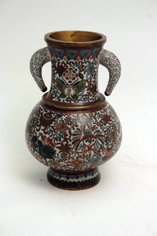- NOTIZIE STORICO CRITICHE Gli smalti cloisonné sono stati importati in Giappone dalla Cina, che per prima ha sviluppato e migliorato una tecnica di origine occidentale. Adoperati soprattutto per i fornimenti di spada, gli smalti giapponesi non erano però utilizzati su grandi superfici. Solo attorno alla seconda metà del XIX secolo, in Giappone si iniziò a produrre oggetti che utilizzassero come decorazione prevalente il cloisonné. Nel giro di poche decine di anni si passò così da una produzione rozza con smalti dall'aspetto "fangoso" a realizzazioni con smalti lucidi e brillanti, senza la evidente presenza dei fili di rame atti a separare i colori.\nQuesto esemplare appartiene a una produzione caratterizzata da smalti di alta qualità, destinata all'esportazione, che si riconosce per l'uso dei marchi "Longevità" e "Fortuna" riportati sul fondo del piede.