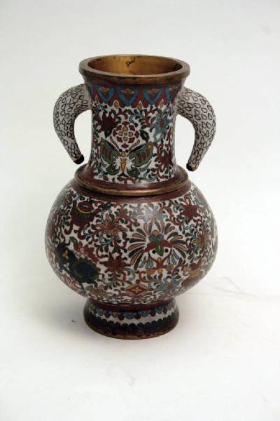 Vaso in rame dorato e decorato con smalti cloisonné, con piede troncoconico, ventre espanso e lungo collo strombato con bocca dal bordo squadrato. Poco sotto il bordo si trovano due manici a forma di corno rivolti verso il basso. Una sporgenza anulare, dorata, separa pancia e collo all'altezza della spalla. Sul corpo sono raffigurati fiori e farfalle, e alcuni simboli religiosi. I colori utilizzati sono il rosso, il blu, il verde e il giallo su fondo bianco prevalente.