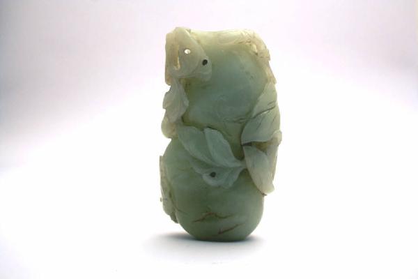 Vasetto in giada di colore verde chiaro con venature bianche, a forma di pesche avvoltie da foglie, con in basso un piccolo pipistrello appeso.