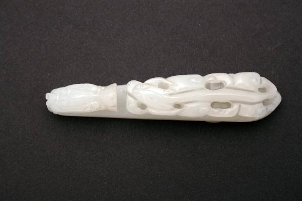 Riproduzione in giada bianca di antica fibbia per cintura . La forma è pressoché quella di una fettuccia sinuosa con le estremità ripiegate a formare due draghi affrontati. Sotto si trova il fermo a forma di cilindro ovale con estremità sporgente a disco.