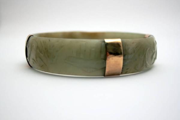 Braccialetto in giada di forma circolare appiattita, decorato a bassorilievo su tutta la superficie con motivi geometrici e fitomorfi. L'oggetto è impreziosito da quattro fascette d'oro.