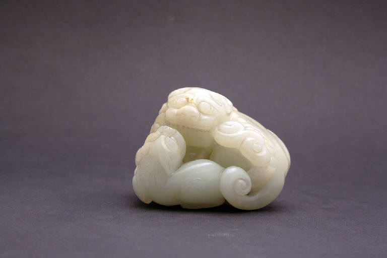 Piccola scultura decorativa in nefrite raffigurante una coppia di leoncini, un adulto e un cucciolo, affrontati.
