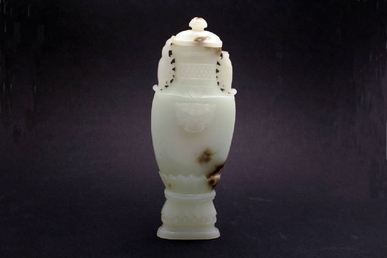 - NOTIZIE STORICO CRITICHE L'aspetto generale di questo vasetto e del suo coperchio, ornato con motivi tipici quali il mascherone e i cerchietti, riprende le forme tradizionali di alcuni bronzi arcaici, spesso reinterpretate in maniera sempre diversa nel corso dei secoli. La forma delle due anse è alquanto peculiare. Soprattutto in tempi moderni, la giada viene valutata per la purezza della pietra. Le impurità evidenti di questo oggetto dimostrano quanto sia difficile per l'artigiano intuirne la presenza prima dell'intaglio.