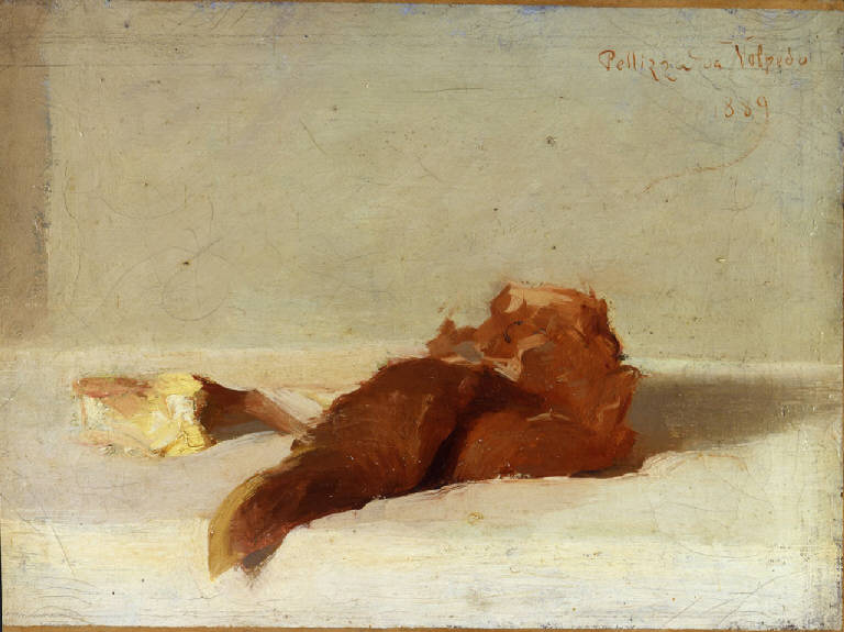 Dipinto a olio su tela di Giuseppe Pellizza da Volpedo di piccole dimensioni, raffigurante un pezzo di carne, posto su un piano bianco.