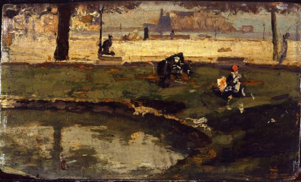 Dipinto a olio di piccole dimensioni di Attilio Pratella, montato in una cornice con soggetti analoghi, raffigurante il parco della Villa Comunale di Napoli.