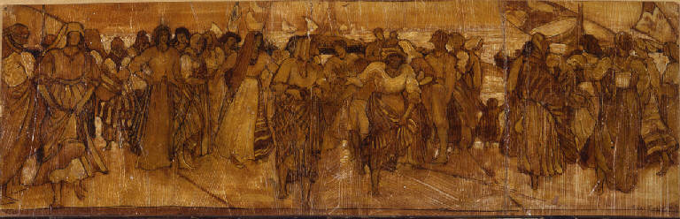 - NOTIZIE STORICO CRITICHE Il dipinto, firmato ma non datato, fa parte del lascito della collezione di Guido Rossi al Museo Nazionale della Scienza e della Tecnica nel 1957 (per cui si rimanda a Giorgione 2009, pp. 55-61).\nL'opera è in mediocre stato di conservazione e presenta una evidente piegatura del supporto al centro. Si tratta di uno studio per la xilografia Lido piceno, realizzata da De Carolis nel 1908. A questa data andrà ascritta anche l'opera in questione, vista la stretta vicinanza con la versione definitiva, da cui lo studio differisce per particolari nella posa di alcune figure, nell'andamento dei panneggi e nel fondo, mentre l'impostazione compositiva è già fissata e indica uno stadio molto avanzato. A conferma che si tratta di uno studio, a cui una pesante verniciatura ha voluto conferire la solidità e lo status di un dipinto, la composizione appare in controparte rispetto alla xilografia stampata essendo preparatoria all'intaglio della matrice in legno, che si conserva al Museo De Carolis a Montefiore dell'Aso. La stessa tecnica di esecuzione serve a studiare gli effetti finali ottenuti nella xilografia, con le linee ad inchiostro che riproducono l'andamento dell'intaglio nel legno e i colori ad olio che ripropongono i rapporti cromatici tra i pochi colori della xilografia, da cui deriva l'effetto quasi monocromo del dipinto.\nIl tema della teoria di figure femminili disposte a fregio era già stato affrontato da De Carolis nell'olio su cartone Pellegrini a Loreto del 1903 (Montecarotto, parrocchia SS. Annunziata), ma l'opera mostra anche consonanze stilistiche con la xilografia La foce del 1908 (Urbino, Galleria Nazionale delle Marche), oltre che con una serie di fotografie realizzate dallo stesso De Carolis (cfr Vivere con l'arte 2009, pp. 28-29).