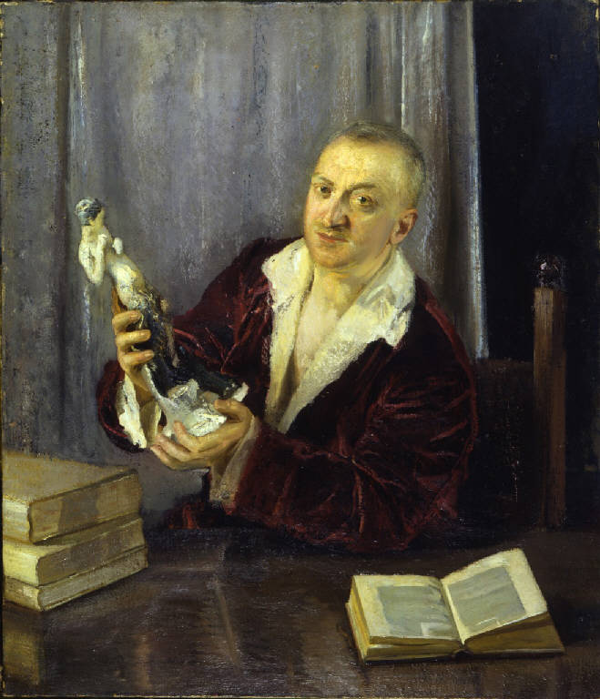- NOTIZIE STORICO CRITICHE Il dipinto fa parte delle tredici opere di Pietro Gaudenzi giunte al Museo Nazionale della Scienza e della Tecnica nel 1957 con il lascito di Guido Rossi, che possedeva un cospicuo nucleo di dipinti del pittore, non tutti pervenuti al museo. L'industriale ebbe un ruolo privilegiato con Gaudenzi: secondo il racconto di Ettore Cozzani, infatti, fu lui a invitarlo a trasferirsi a Milano, divenendone per anni mecenate e committente (Cozzani 1923, p. 34).\nUn ruolo esemplificato da questo ritratto, in cui il pittore ha raffigurato l'industriale milanese come un raffinato collezionista: circondato da libri esamina -e mostra- un pezzo della sua collezione: sembra trattarsi di una statuetta in porcellana dipinta, che non fu inclusa nel lascito al museo. L'impostazione del dipinto è chiaramente ispirata al noto Ritratto di Jacopo Strada di Tiziano (Vienna, Kunsthistorisches Museum), da cui Gaudenzi riprende anche il cromatismo vibrante, evidente nella vestaglia da camera in velluto bordeaux. \nLa datazione andrà attestata alla seconda metà degli anni venti, sia per l'età dell'effigiato, nato nel 1881, sia per ragioni stilistiche: all'evidente ricordo dei maestri rinascimentali, infatti, si unisce una materia pittorica ricca, fatta di creste e grumi di colore, alternati a stesure più lavorate e sfumate in toni cupi, che mostrano ancora l'eco delle prime opere.
