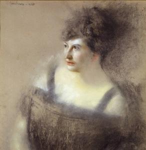 Disegno a pastello di medie dimensioni di Pietro Gaudenzi, raffigurante Pia Rossi Albanese, prima moglie di Guido Rossi, a mezzo busto, con la testa rivolta a sinistra, con indosso un abito scollato nero.