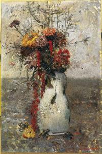 Dipinto a olio di medie dimensioni di Pietro Gaudenzi, raffigurante un vaso bianco, con una composizione floreale, posato su un piano grigio.