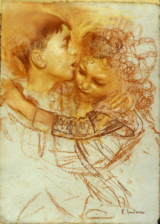 Disegno a sanguigna di medie dimensioni di Pietro Gaudenzi, raffigurante un bambino e una bambina a mezzobusto che si abbraccciano, rifinito solo nei volti e appena abbozzato per il resto.