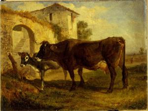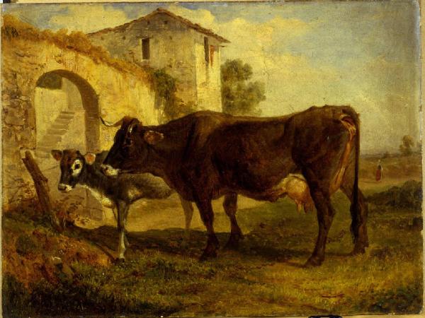 Dipinto a olio di piccole dimensioni raffigurante un bue e un vitello rivolti verso sinistra, di fronte ad un casolare in campagna.