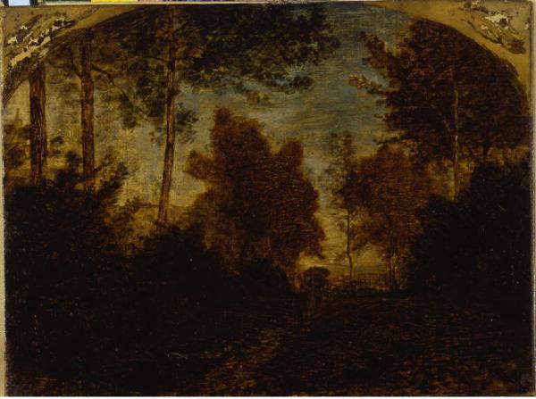 Dipinto a olio di piccole dimensioni centinato, di Antonio Fontanesi, raffigurante un paesaggio con alberi lungo una roggia