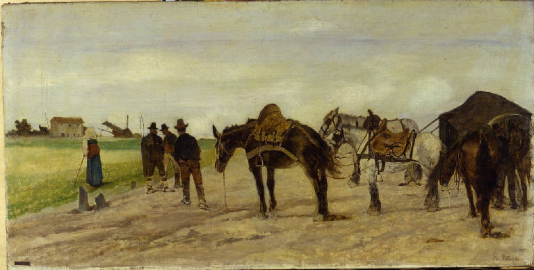 - NOTIZIE STORICO CRITICHE Il quadro è giunto al Museo Nazionale della Scienza e della Tecnica nel 1957 con il lascito della raccolta di Guido Rossi, che probabilmente lo acquistò all'asta della collezione di Alessandro Corradini, grande collezionista di pittura macchiaiola, tenutasi nel 1926 alla Galleria Pesaro di Milano, di cui il verso dell'opera conserva ancora l'etichetta.\nL'opera è stata datata al 1879 circa da Malesci, seguito da Della Chiesa (Malesci 1961, p. 407; Della Chiesa 1970, p. 100), mentre Luciano Caramel non ha escluso una datazione intorno al 1881, anno in cui il dipinto viene esposto a Milano (Caramel 1986, n. 54, snp). \nLa veduta di una una strada di campagna animata solo dalla sosta di alcuni carri va messa in relazione con la presenza di Fattori a Roma a partire dal 1871, secondo la cronologia ricostruita da Andrea Baboni (Giovanni Fattori 1998), e alla conseguente realizzazione di vedute dell'Agro pontino, tra cui un posto preminente ricopriva Il mercato dei cavalli a Roma, perduto nel viaggio di ritorno dall'esposizione di Melbourne del 1880 a cui era stato inviato. Da questo quadro Fattori riprende la posa di alcune figure, mentre un disegno della Galleria d'Arte Moderna Giannoni di Novara riproduce nei dettagli i due cavalli bianchi e le cinghie che li legano al carro (P. Plebani, in Induno, Fattori, Nomellini, Viani 2005, p. 68).\nIndicato da Dario Durbè come l'opera più impegnativa rimastaci delle impressioni riportate da Fattori nel viaggio romano (Durbè 1995, p. 352), il dipinto mostra la capacità di sintesi raggiunta dal pittore, attraverso la semplicità della composizione, la solidità di impianto e il ritmo lento e cadenzato delle linee.