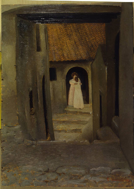 Dipinto a olio di medie dimensioni di Pietro Gaudenzi, raffigurante la Visitazione: sulla porta di un casa vista da una stardina lastricata due figure femminili vestite di bianco si abbracciano.