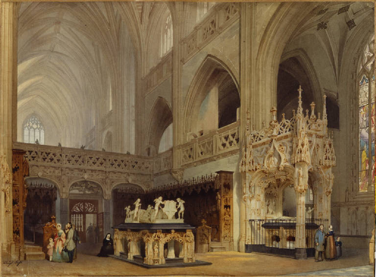 - NOTIZIE STORICO CRITICHE L'acquerello è giunto al Museo Nazionale della Scienza e della Tecnica nel 1957 con il lascito di Guido Rossi. Vedutista accuratissimo e dettagliato sulla tradizione di Giovanni Migliara, Bisi ritornò più volte sulla veduta della chiesa di San Nicola di Tolentino a Bourg en Bresse, visitata direttamente nei viaggi in Francia: si recò infatti in Borgogna e in Savoia, ritraendo anche la chiesa di Altacomba.\nNel 1842 Bisi espose a Brera l'Interno della chiesa di Brou a Bourg en Bresse di commissione del conte Stefano Riva e Il coro della chiesa di Brou coi monumenti di Filiberto Duca di Savoja, di Margherita d'Austria e di Margherita di Borbone per Antonio Litta Visconti; nel 1846 una Veduta del coro della chiesa di Brou a Borg-en-Bresse, di proprietà di Camillo Brozzoni, oggi alla Pinacoteca Tosio Martinengo (cfr Dai neoclassici ai futuristi 1989, cat. n. 73), che ritrae la stessa zona della chiesa da un'altra angolazione, e nel 1851 I monumenti di Margherita d'Austria e di Filiberto il Bello nella chiesa di Brou a Bourg-en-Bresse commissionato dal Re di Sardegna, oggi al Palazzo Reale di Torino. Al 1847 risale un acquerello raffigurante La chiesa di Brou, donato in favore dei ciechi, e del 1842 è un altro acquerello del medesimo soggetto, eseguito per il duca Litta (Catalogo 1886, p. 93): il dipinto si potrebbe identificare in quest'ultimo, o forse in una replica, databile sempre nel quinto decennio. \nNel coro della chiesa, minutamente descritto si riconoscono chiaramente la tomba di Margherita d'Austria sulla destra e quella di Filiberto il Bello al centro, mentre all'estrema sinistra si intravede la tomba di Margherita di Borbone.