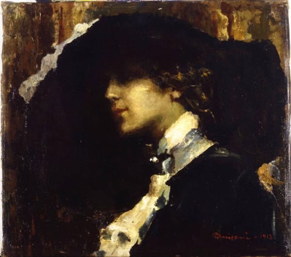Dipinto a olio di piccole dimensioni di Giuseppe Amisani, raffigurante una donna a mezzobusto, con il profilo rivolto verso sinistra: indossa un grande cappello nero e un abito nero con camicia bianca.