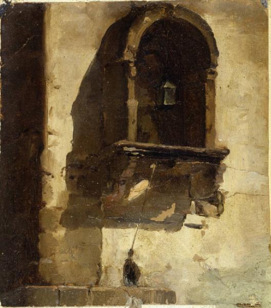 Dipinto di piccole dimensioni raffigurante un tabernacolo ad arco su una parete intonacata.