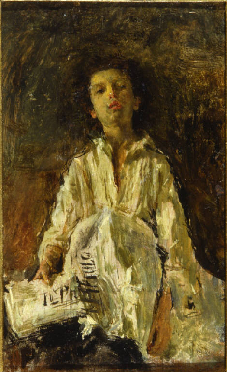 Dipinto a olio di piccole dimensioni di Antonio Mancini, raffigurante un ragazzino con camicia bianca rivolto frontalmente al riguardante, che porge un giornale con la mano destra e tiene dei giornali sotto il braccio sinistro.