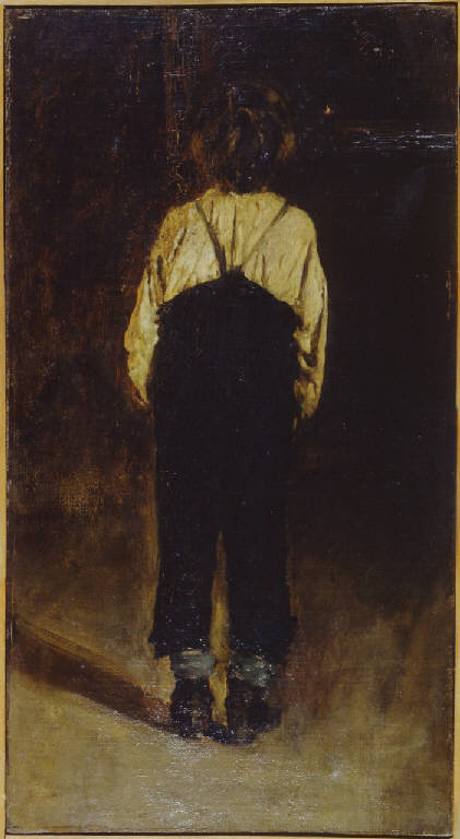Dipinto a olio di piccole dimensioni di Antonio Mancini, raffigurante un ragazzino con camicia bianca e pantaloni neri, con le bretelle, visto di spalle, in chiesa.