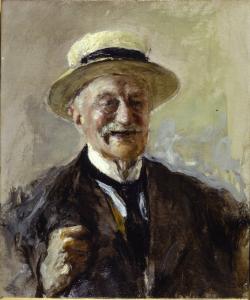 Dipinto a olio di medie dimensioni di Antonio Mancini, rappresentante un autoritratto del pittore a mezzo busto a circa settant'anni, con giacca e cravatta e una paglietta in testa.