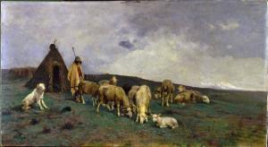 Dipinto a olio di medie dimensioni di Giuseppe Raggio, raffigurante un giovane pastore con un gregge di pecore e un cane, di fronte a una tenda conica, su un rilievo erboso.