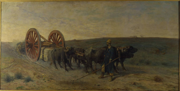 Dipinto a olio di grandi dimensioni di Giuseppe Raggio, raffigurante il trasporto di un masso d travertino, caricato su un carro rosso e trainato da sinistra verso destra da quattro bufali.