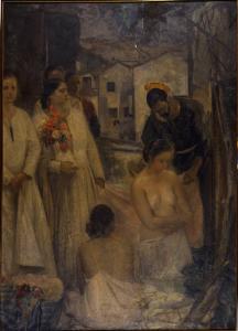 - NOTIZIE STORICO CRITICHE Il dipinto fa parte delle tredici opere di Pietro Gaudenzi giunte al Museo Nazionale della Scienza e della Tecnica nel 1957 con il lascito di Guido Rossi, che possedeva un cospicuo nucleo di dipinti del pittore, non tutti pervenuti al museo. L'industriale ebbe un ruolo privilegiato con Gaudenzi: secondo il racconto di Ettore Cozzani, infatti, fu lui a invitarlo a trasferirsi a Milano, divenendone per anni mecenate e committente (Cozzani 1923, p. 34).\nDatato finora al 1930 circa (Caramel 1986, n. 44 snp), il dipinto si potrebbe spostare in avanti di qualche anno, in prossimità del 1934. Va infatti messo in relazione con il grande Battesimo della Galleria d'Arte Moderna Giannoni di Novara (inv. 337), datato appunto al 1934, anno in cui fu esposto alla Seconda Mostra d'Arte Sacra di Roma (cfr La Galleria d'Arte Moderna 1993, p. 156). Il catalogo riporta anche un secondo dipinto intitolato Battesimo, non illustrato, (II Mostra Internazionale 1934, p. 163 n. 3) che si potrebbe individuare in questo, che con l'opera di Novara condivide diversi elementi tanto da far pensare a una serie: l'identica altezza della tela, l'impostazione monumentale, la scansione volumetrica, la posizione delle figure nello spazio, la tavolozza chiara e luminosa, la figura del santo, lo scorcio paesaggistico al centro, quasi uguale in entrambe le opere e in cui si può forse riconoscere Anticoli.