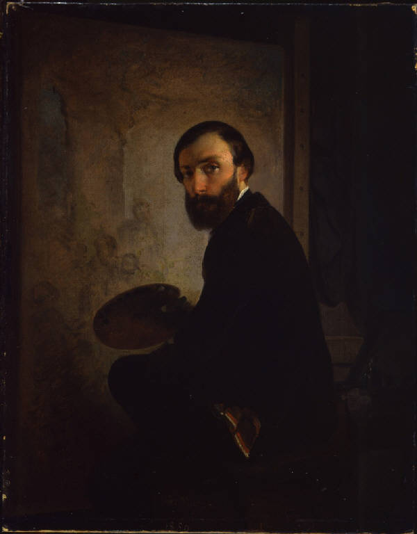 - NOTIZIE STORICO CRITICHE Il dipinto è giunto al Museo Nazionale della Scienza e della Tecnica con il lascito del 1976 di Paolina Farnesi, vedova di Aldo Mazza, di cui eseguiva la volontà di lasciare al museo un nucleo di opere proprie e del nonno Giuseppe Mazza, oltre che di altri artisti dell'ottocento lombardo, secondo un progetto accarezzato almeno dal 1958, dopo aver organizzato a Milano nel 1942 una mostra a loro dedicata.\nFirmata e datata 1850, è un'opera della prima maturità del pittore, negli anni in cui più evidente è l'influenza esercitata dalla pittura del maestro Francesco Hayez, di cui sembra richiamare l'Autoritratto del 1848 (Milano, Pinacoteca di Brera): Mazza si rappresenta però in una posa meno solenne e più informale, seduto davanti alla tela che sta dipingendo.