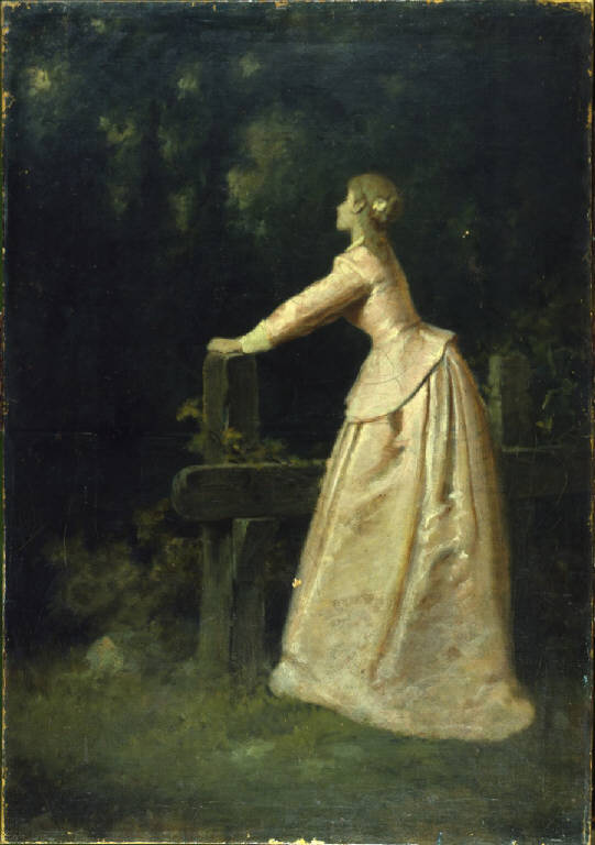 Dipinto a olio di medie dimensioni di Giuseppe Mazza, raffigurante una donna in piedi a figura intera, rivolta di profilo verso sinistra, appoggiata a una staccionata; veste un abito lungo rosa.