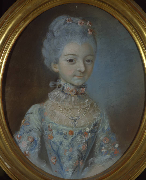 Pastello di medie dimensioni inscritto in un ovale, raffigurante una giovane a mezzobusto, rivolta verso il riguardante, in abiti settecenteschi azzurri, con parrucca inciprata.