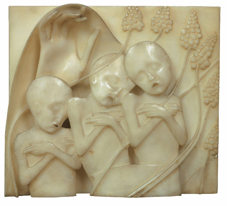 Piccolo rilievo in marmo di Adolfo Wildt, raffigurante tre bambini con gli occhi chiusi, intrecciati da rami con frutti e sormontati da una mano.