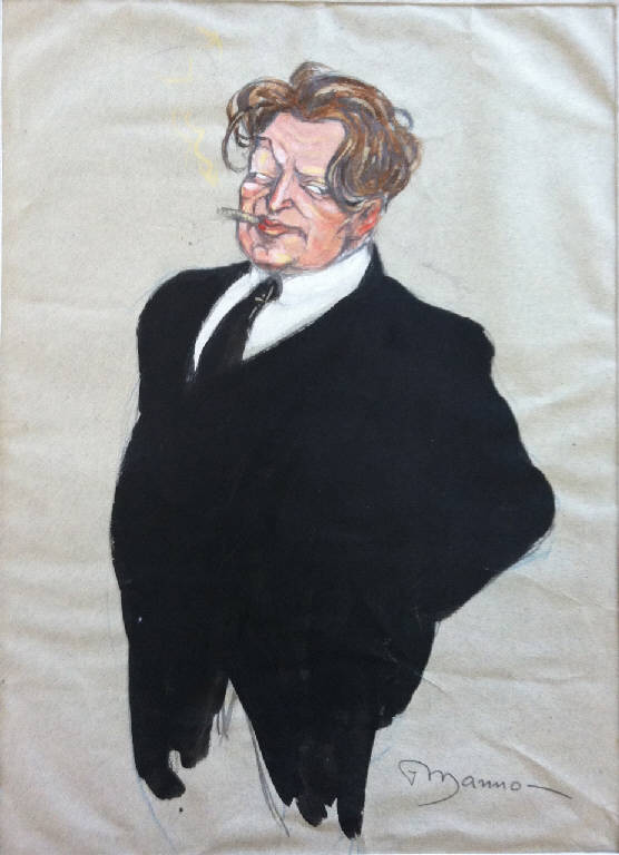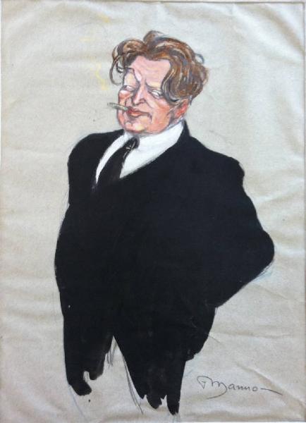 Caricatura disegnata a pastello, raffigurante Francesco Mauro a mezza figura con un completo nero e il sigaro in bocca.