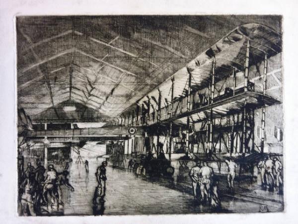 Incisione raffigurante l'interno di un hangar con un aereo al centro e diversi uomini.