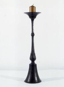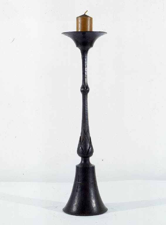 Candeliere in ferro battuto su base circolare a forma di campana, con quattro croci incise