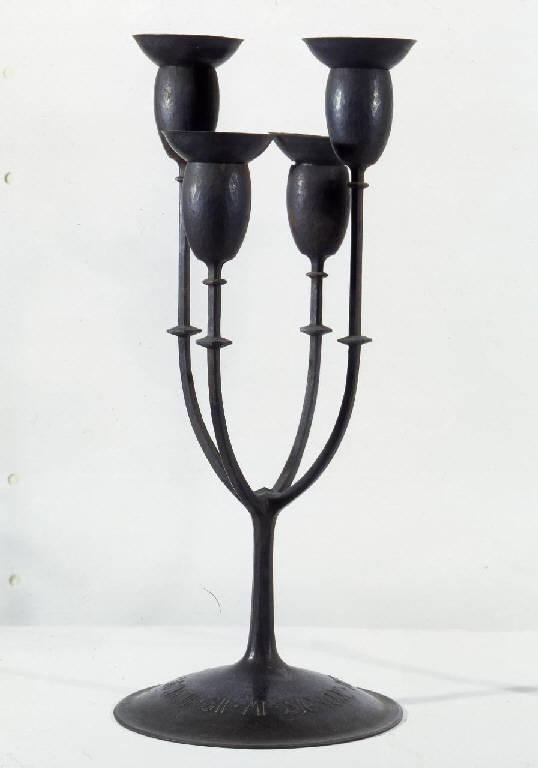 Candeliere in ferro battuto a quattro braccia, su base circolare. La base, in forma di coppa, reca un iscrizione dal cantico delle creature di San Francesco.