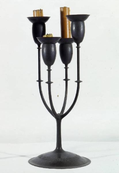 Candeliere in ferro battuto a quattro braccia, su base circolare. La base, in forma di coppa, reca un iscrizione dal cantico delle creature di San Francesco.