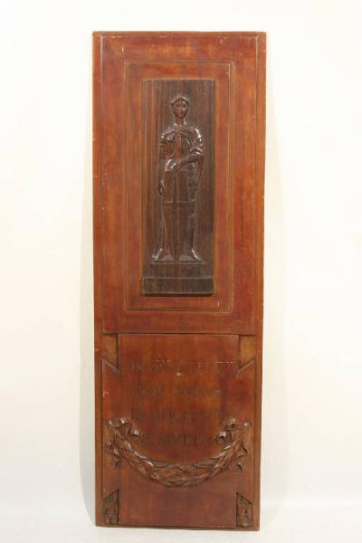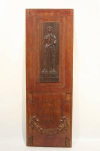 Pannello ligneo costituente un'anta di mobile. Sul recto un bassorilievo raffigurante San Giorgio. Sul verso un pappagallo dipinto a olio.