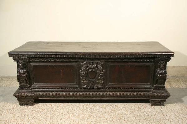 Cassapanca in noce, scolpita e sagomata, con due cariatidi ai lati e uno stemma al centro.