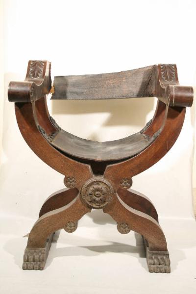 Sedia dantesca in legno di noce scolpita con rivestimento in pelle. Una rosetta di legno decora il perno frontale. I piedi della sedia sono in forma di zampe leonine