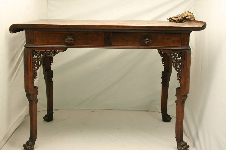 Tavolino in legno di teak, con gambe decorate e scolpite a zampa di leone. Due cassetti con maniglie in bronzo a forma di fiori e foglie. Sul piano sono incisi motivi floreali e un drago in bronzo dorato sul lato destro.